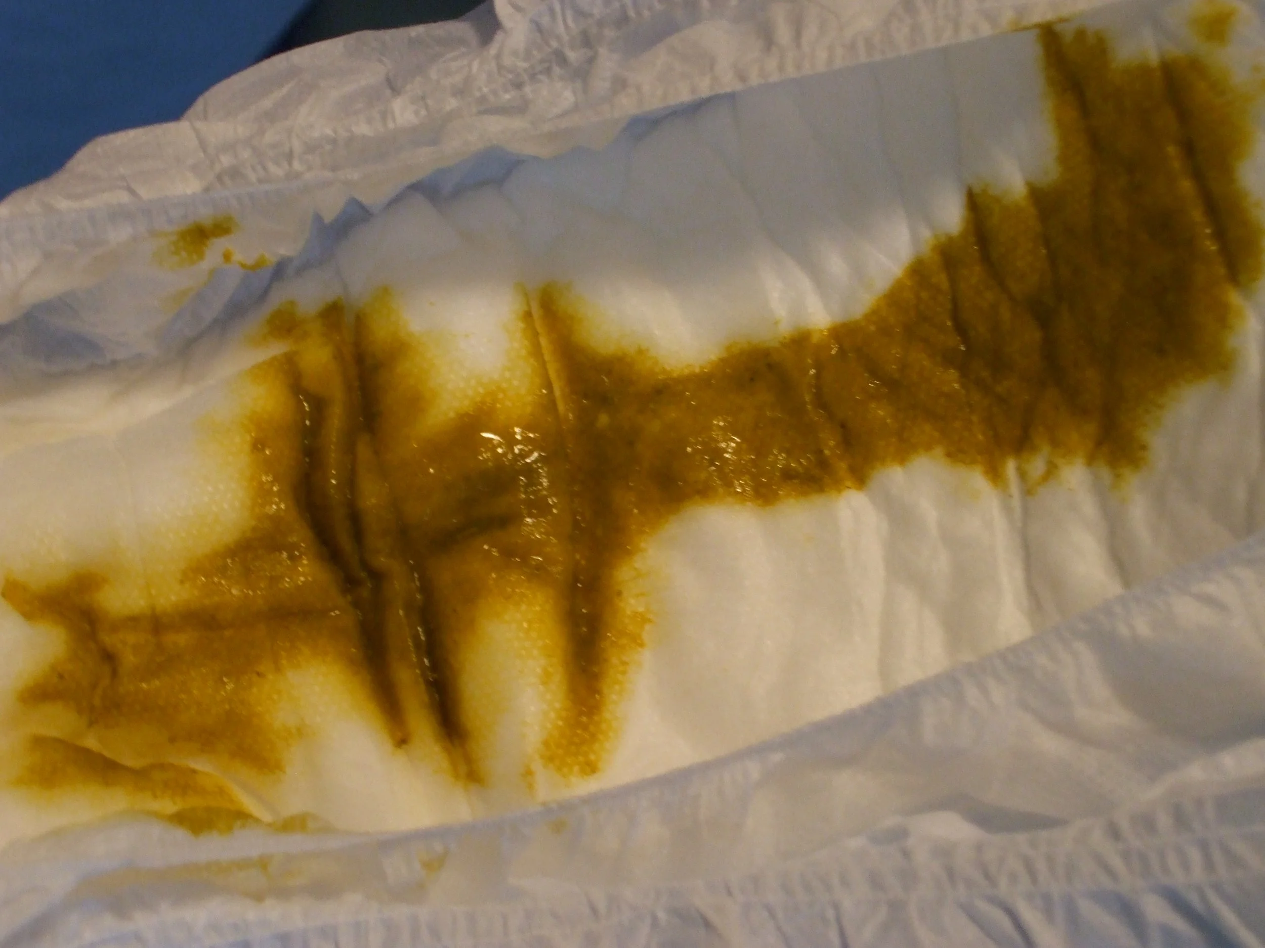 Cindy was mystified why even cooked pear – generally considered a failsafe food, incapable of triggering allergy reactions – caused Peter as many problems as any other food she’d tried him with. However, his bowel motions were typically as pictured above. At the time this one was photographed, Peter had not had anything other than breast milk for almost a month. These motions were clearly abnormal for an exclusively breastfed baby – three or four of them daily, runny, gassy, often mucousy, always dark brown and usually offensively smelly.